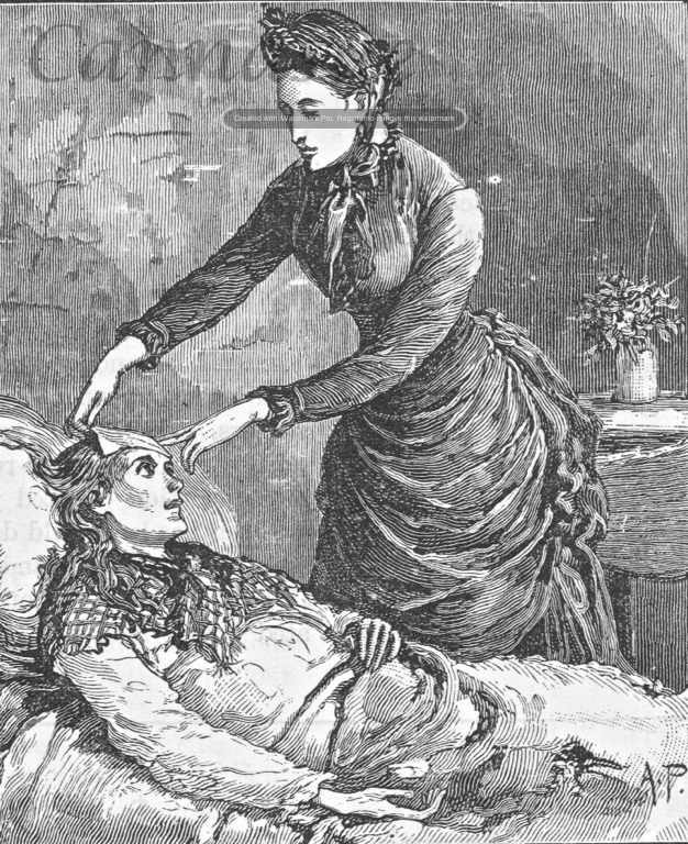 They climbed the narrow, creaky wooden stairs up to the bedroom where Martha was laid, being being tended by one of her neighbours, Catherine Guppy. woman in sick bed